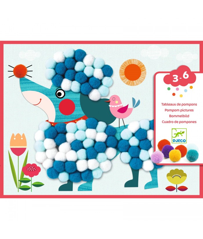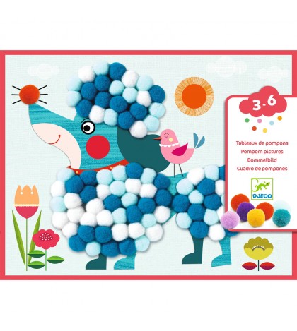Usando la variedad de elementos collage y stick para crear 4 diseños de perritos con pompones de fieltro y de colores diferentes.